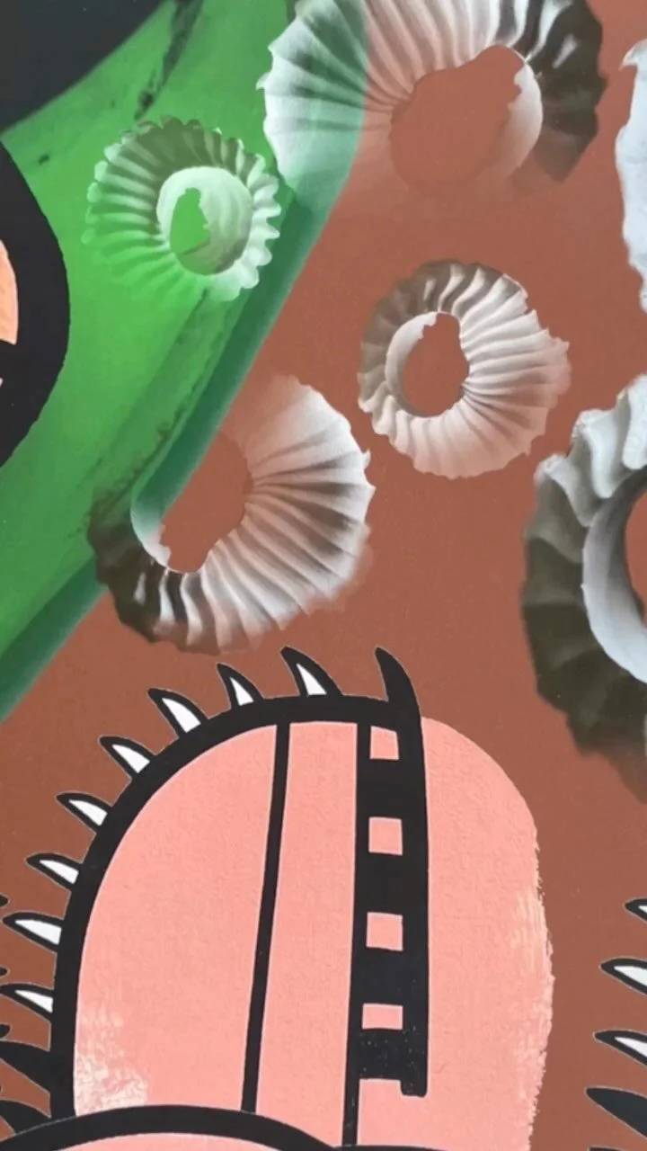 Inspired by biomimicry, Kim’s visual language engages the organic fluidity of nature. Hand-sculpted amoebas, cells, sea creatures, and linear forms are created from clay, photographed, and then digitally crafted. Paintings are photographed, magnified, and manipulated into patterns.